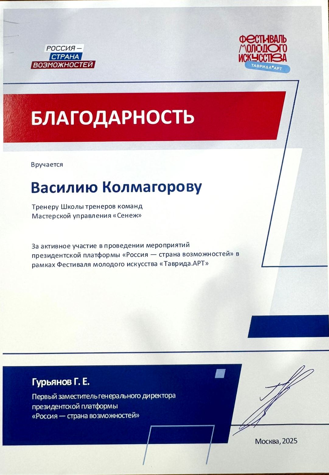 Первый заместитель генерального директора президентской платформы «Россия – страна возможностей» Геннадий Гурьянов выразил благодарность Василию Колмагорову, помощнику нотариуса города Сургута Николая Бахвалова.